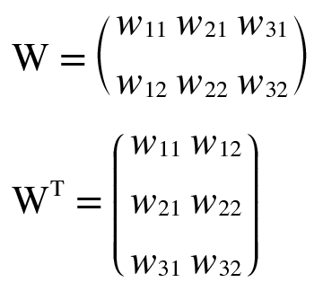 W^T의 T는 전치행렬을 뜻한다. 전치행렬은 W의 (i, j) 위치의 원소를 (j, i) 위치로 바꾼 것을 말한다. 수식으로는 다음과 같다.