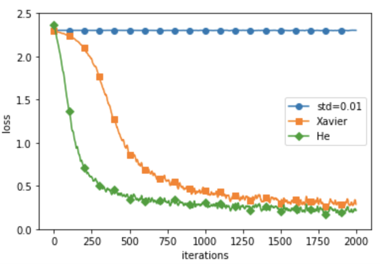 위 그림에서 보듯 std = 0.01일 때는 학습이 전혀 이뤄지지 않는다.