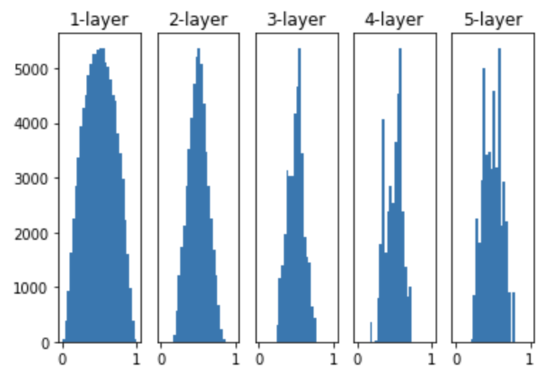 각 층의 활성화값들이 0과 1에 집중 분포되어 있으며, Sigmoide 함수는 출력이 0에 가까워지자 미분의 값은 0으로 표현