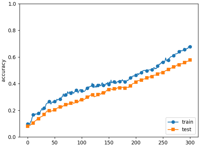 import os import sys sys.path.append(os.pardir) # 부모 디렉터리의 파일을 가져올 수 있도록 설정 import numpy as np import matplotlib.pyplot as plt from dataset.mnist import load_mnist from common.multi_layer_net_extend import MultiLayerNetExtend from common.trainer import Trainer from common.util import shuffle_dataset (x_train, t_train), (x_test, t_test) = load_mnist(normalize=True) x_train, t_train = shuffle_dataset(x_train, t_train) val_rate = 0.2 val_num = int(x_train.shape[0] * val_rate) print(val_num) # 검증 Data Set x_train shape 60000 중 20% 추출하여 12,000개 검증 Data Set 선정 # x_val = x_train[:vali_num] # 오버피팅을 재현하기 위해 학습 데이터 수를 줄임 x_train = x_train[:300] t_train = t_train[:300] # 드롭아웃 사용 유무와 비울 설정 ======================== use_dropout = True # 드롭아웃을 쓰지 않을 때는 False dropout_ratio = 0.2 # ==================================================== network = MultiLayerNetExtend(input_size=784, hidden_size_list=[100, 100, 100, 100, 100, 100], output_size=10, use_dropout=use_dropout, dropout_ration=dropout_ratio) trainer = Trainer(network, x_train, t_train, x_test, t_test, epochs=301, mini_batch_size=100, optimizer='sgd', optimizer_param={'lr': 0.01}, verbose=True) trainer.train() train_acc_list, test_acc_list = trainer.train_acc_list, trainer.test_acc_list # 그래프 그리기========== markers = {'train': 'o', 'test': 's'} x = np.arange(len(train_acc_list)) plt.plot(x, train_acc_list, marker='o', label='train', markevery=10) plt.plot(x, test_acc_list, marker='s', label='test', markevery=10) plt.xlabel("epochs") plt.ylabel("accuracy") plt.ylim(0, 1.0) plt.legend(loc='lower right') plt.show() - 순전파 때 신호를 통과 시키는 뉴런은 역전파 때도 신호를 그대로 통과 시키고, 순전파 때 통과시키지 않은 뉴런은