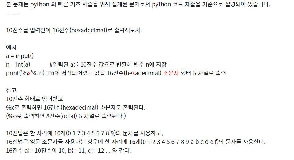 print('%x' % n)'알고리즘 예제 > Python' 카테고리의 다른 글