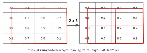 위의 과정을 모든 sample point에 대해 진행해준다. 하나의 영역 안에 4개의 값이 생기게 되는데 max 또는 average pooling을 사용해 2x2의 output을 얻어낼 수 있다.
