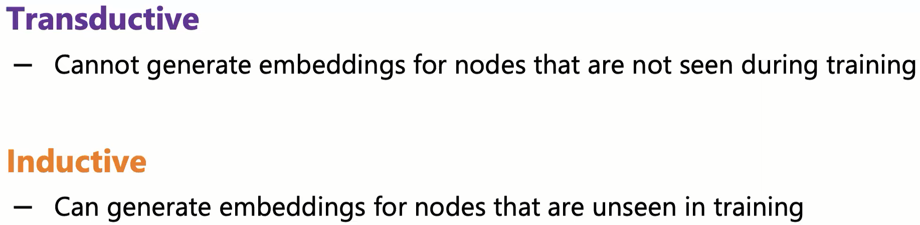 요약하면, "transductive" 학습은 학습 데이터셋 내의 노드에 대한 고정된 임베딩을 생성하는 반면, "inductive" 학습은 임베딩을 생성하는 인코더 함수를 학습하여 새로운 데이터에 대해 임베딩을 생성할 수 있습니다. 각 접근 방식은 그 자체의 한계점을 가지고 있습니다.