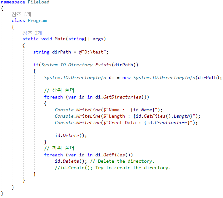 해당 경로의 파일 삭제 기능 구현 요청으로 인해 DirectoryInfo Class 사용