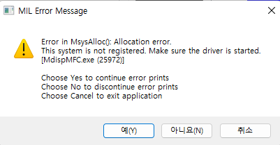 MIL Program을 실행 시키는 H/W 구성 內, Matrox 보드가 없는 경우 위와 같은 에러가 발생 할 수 있음. 초기 Matrox 프로그램 설치 시 Default Value / System Type을 host로 할당하면 문제가 되지 않으나, 그렇지 않은 경우 위와 같은 에러가 발생 ** 해결 방법 1. MILConfig에서 System Type 확인 2. System Type - Host로 변경 필요 Host로 변경하면 보드 없이 cpu로만 Matrox Example Launcher 동작됨