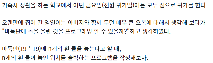✍ CodeUp 문제 / 출처 : Codeup 👉 Input → 3 5 👉 Output → 👉 Source Code n = int(input()) num = list(list(map(int,input().split())) for _ in range(n)) # list 2번 감싸줘야 됨 for i in range(1, 20): for j in range(1, 20): if [i, j] in num: print(1, end = ' ') else: print(0, end = ' ') print()