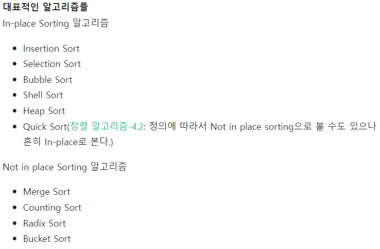 In place vs not In place Algorithm in place 정렬은 원소들의 개수에 비해 충분히 무시할 만한 저장 공간만을 더 사용하는 정렬 알고리즘 not in place 정렬은 원소들의 개수에 비례하여 저장 공간을 더 사용하는 정렬 알고리즘 sentinel value란? -. 더 이상의 처리 또는 사용 할 데이터가 없는 걸 나타내기 위한 값 e.g. merge sort에서 2개의 list 내의 끝에 위치한 값을 ∞로 설정하기도 한다. https://velog.io/@cookncoding/%EC%95%8C%EA%B3%A0%EB%A6%AC%EC%A6%98-%EA%B0%9C%EB%85%90-Stable-Sort-Inplace [알고리즘 개념] Stable Sort &Inplace 컴퓨터 ..